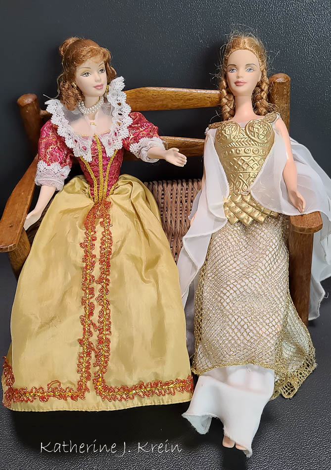 I can relate better to the gold breastplate and chainmail skirt than the princess with pearls and royal gown. I never had the patience to play for long with Barbie dolls, though I purchased many for my daughter who loved them. I tried to look up their names online since their boxes are long gone. I had success finding the princess but no luck finding the name for our golden goddess (a name which I gave her.)