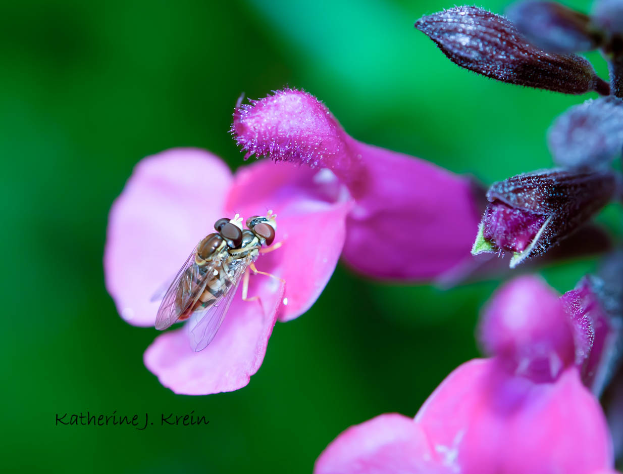The garden hoverfly believes in making love, not war. This couple gets intimate on a Salvia greggii named "Wild Thing." The setting seems appropriate.