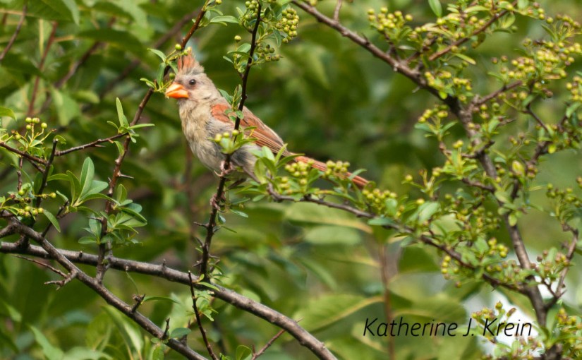 Can you see those thorns? The female cardinal is not intimidated.She patiently waits for those green berries to turn the color of fire orange.This shrub can grow up fairly tall, though the branches are spindly and can curve if not trained to grow upon a trellis or wall. This plant can be very lovely if it is espaliered. It was in my garden already growing wild before I discovered it. It is gone now.