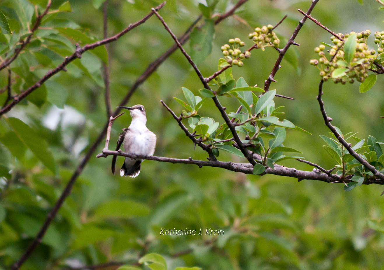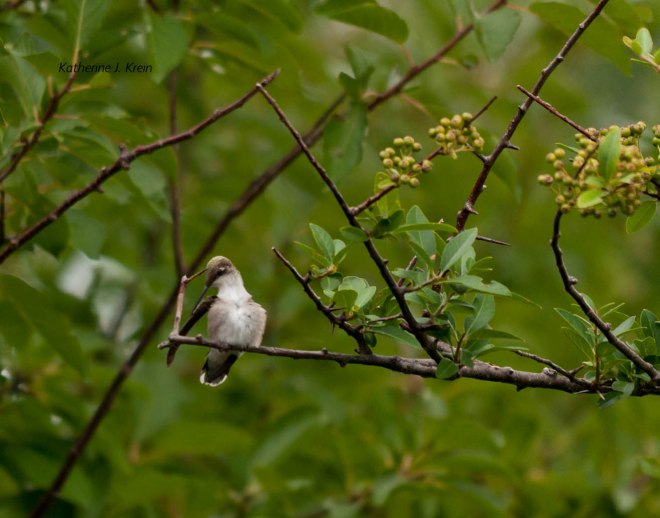 I also found some pictures of a hummingbird grooming. I chose this picture since the setting is a pyracantha. Compare its long pointy beak with those thorns. They are almost the same size. Be careful when you are photographing wild things.