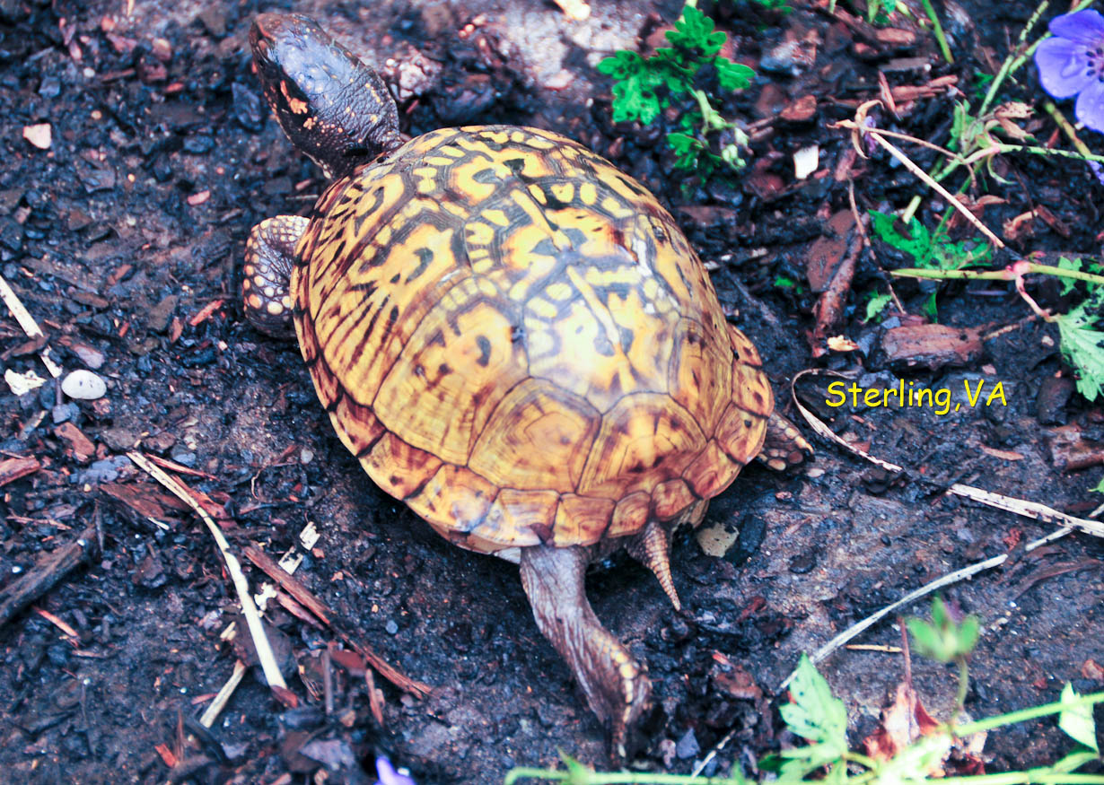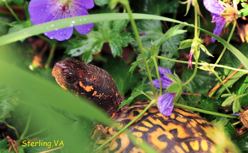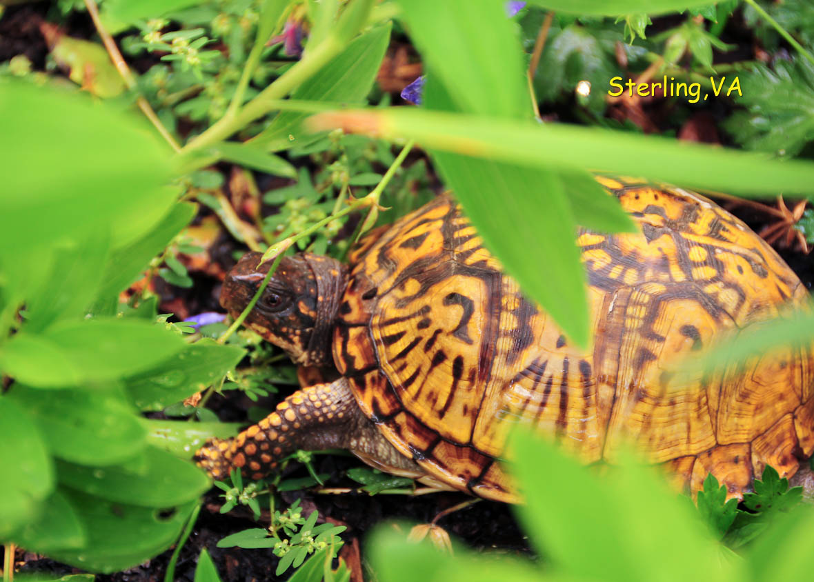 This turtle was moving a fast turtle speed as it tried to get away from my prying eyes. The garden provided cover,though the terrain was uneven and rough in spots. Its shell provides cover for a heavy price. It elongates its neck and little legs. This allows it to move faster than you might think. I was unprepared for its speed as I tried to snap some pictures.