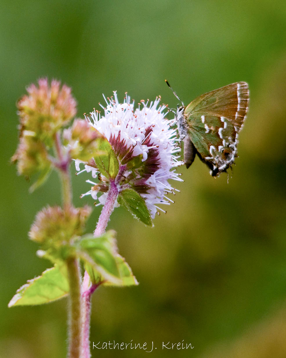This green,brown and white butterfly is called a juniper hairstreak. It has one orange and black eye-spot. The plant is a water mint which was very popular with all our visitors.