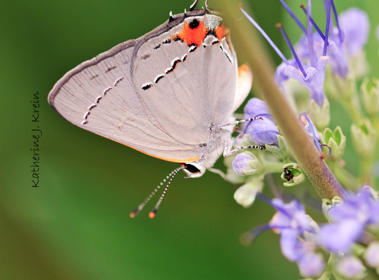 Here is a little grey hairstreak. This was my first picture with a new camera lens. The plant is a blue mist shrub which was also a popular choice with all our visiting insects. Here you get a better view of the orange and black eye spots. This is the most common type of hairstreak. Both the juniper and grey are very small. These pictures make them look larger than they are.