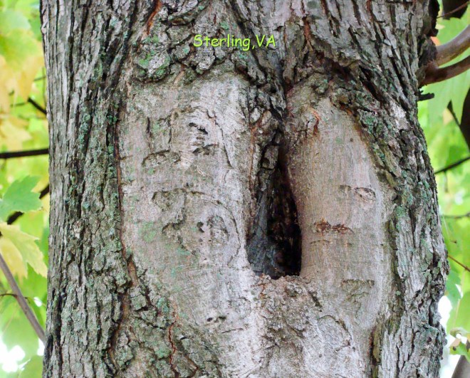 My recent posts have focused on eye-spots and seeing faces in patterns. Here is a close-up of the silver maple tree that was sacrificed for our flower pond. Can you see faces in the split bark? I used to see two faces here, and today I saw something new. I called them my tree people, and they were trapped within its trunk. I like to think that when the tree was cut down their spirits were set free.