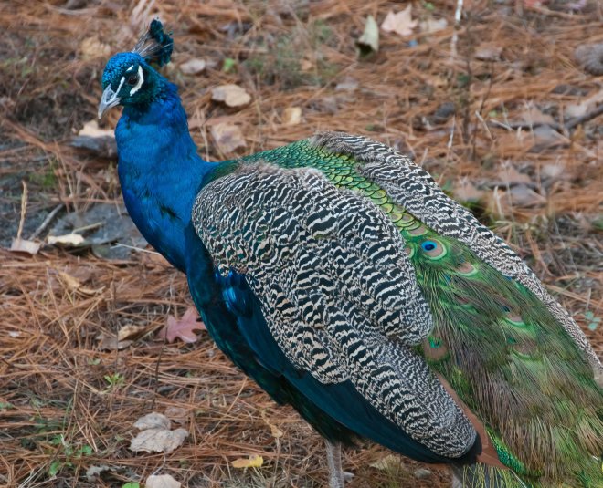Since I recently mentioned peacocks in my previous thoughts about butterfly eye spots, I decided to show a peacock (or peafowl) from the same zoo (Salisbury, Maryland). The picture is from the same trip. I was disappointed it would not open its feathers for me.