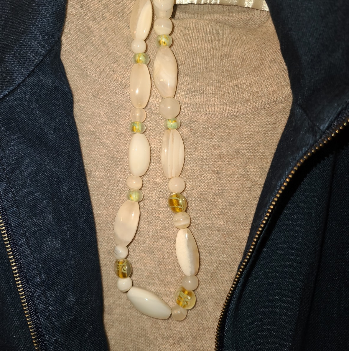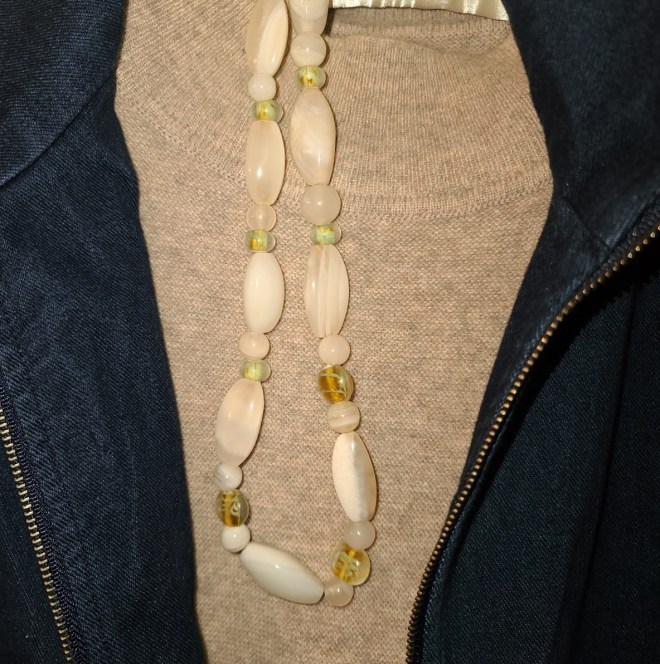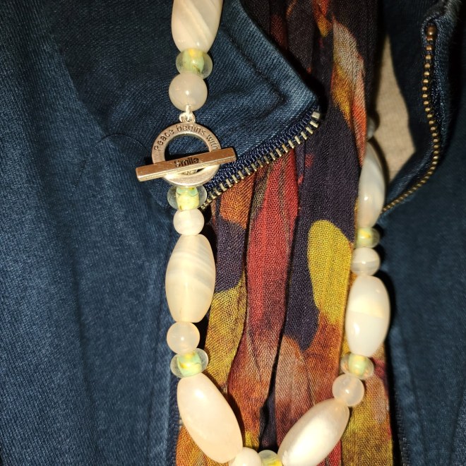 In search of some unique jewelry gifts for my daughter, I have been going through boxes of inherited trinkets and beads. I rediscovered some crafting supplies I purchased long ago. Re-using & re-designing is a earth friendly practice I like to employ. My mother had a very long white stone necklace with black fabric spacers. It was ugly in its original design, not to mention the length made it too heavy. Since I am a scavenger at heart, I disassembled a part of it to re-use. The necklace fasteners I found in my old crafting box became useful. I chose the one that had an upbeat message: "Peace begins with a...Smile" Possibly in the upcoming new year I will get back into jewelry crafting. Below are a couple of pictures.