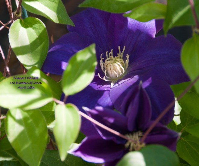 The Hellebores have taken over the back garden to the left of the deck. They began to bloom weeks ago and they are still blooming. I cleaned out the flute boy fountain, though I have not installed a pump. I did put in a mosquito dunk inside the cavity under the boy. The birds keep this area busy with activity. This is the general area where I have the clematis, Diana’s Delight. I noticed a couple of weeks ago that this plant was promising to thrive this season. Yesterday when I was all dressed and protected ready to attack the laurel around our deck, which is in sad need of an aggressive pruning, I noticed that this clematis had three open blooms and many buds in line for future blooming. I was not set up to photograph anything, however, I could not resist capturing the purple beauty. I went on to successfully prune the laurel. It now has some bare places where the old wood needed to be cut out. From my kitchen window I can now see the round pattern in our patio and a wide clear view of the stone bird bath standing in a corner where the dirt meets the grass.