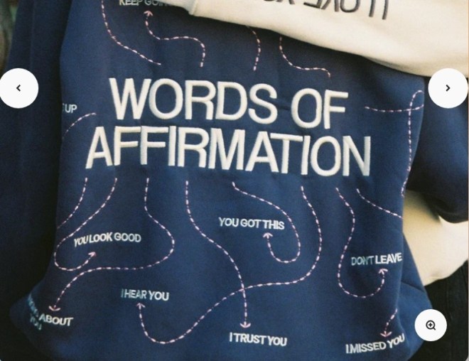 I found the website, and I found the “Words of Affirmation” hoodie. I would have preferred a crewneck with these words, but still I liked the words so much that I bought one in a navy color. I work in a school, and I love the messages that this will spread to everyone that sees it.