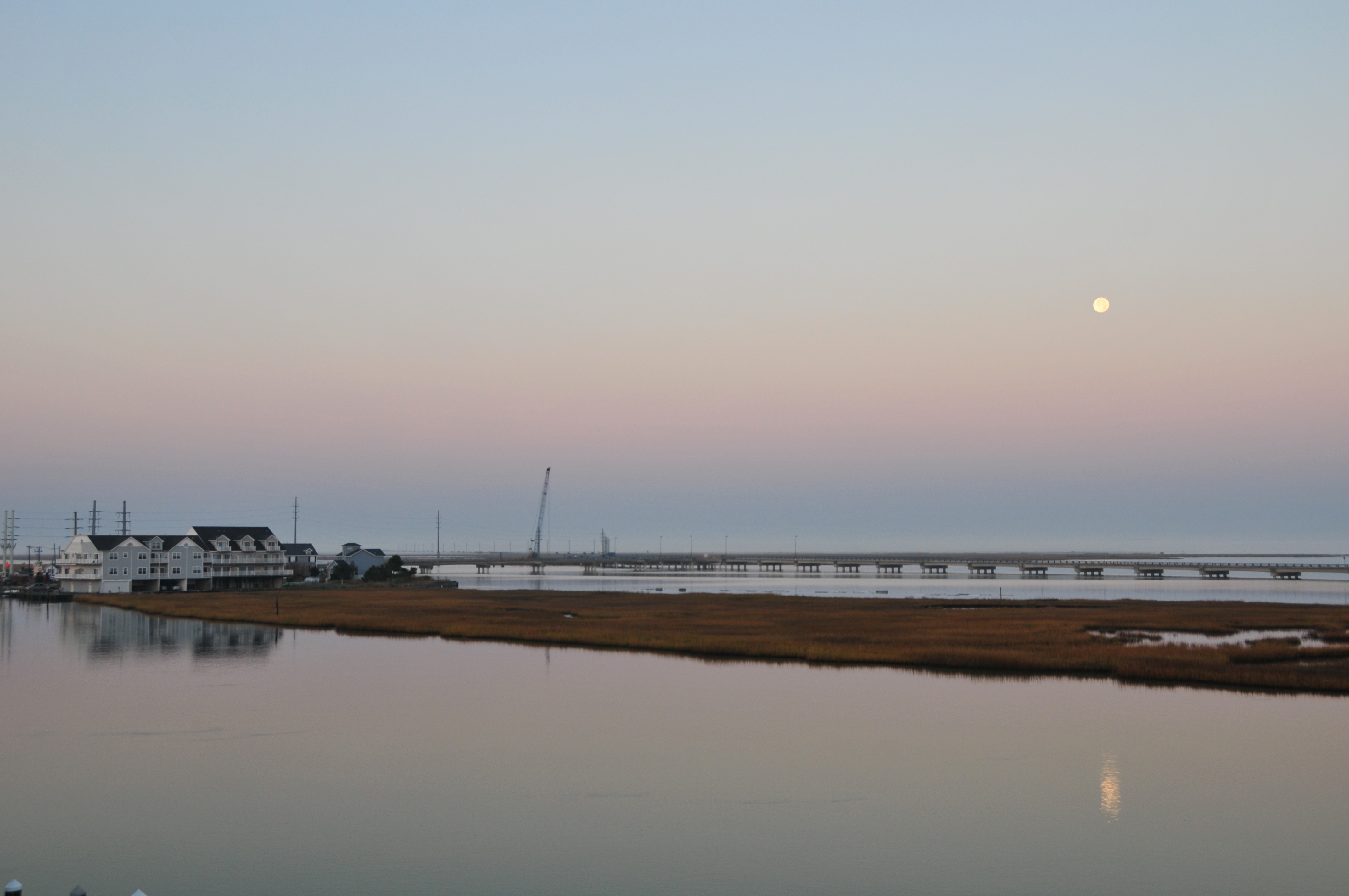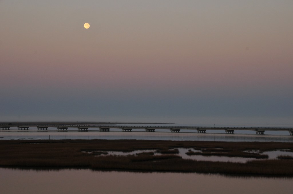 The sun begins to rise with the moon still in the sky.The sun is higher and the moon begins to fade. The day takes over.The sun is setting just over the bridge and the night takes over.