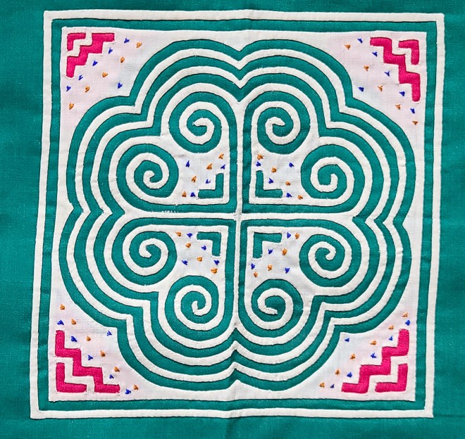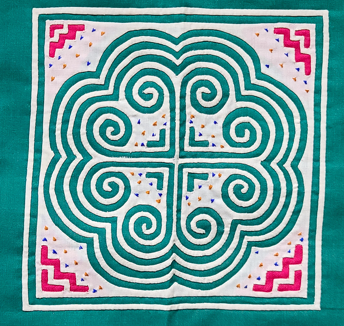 While doing this research I also learned a little more about a quilt square I found among my mother-in-law's quilt supplies and fabrics. It was in a plastic bag with a note from where she had purchased it. It was made by a Hmong artist who had immigrated to Minnesota.It is pictured below.